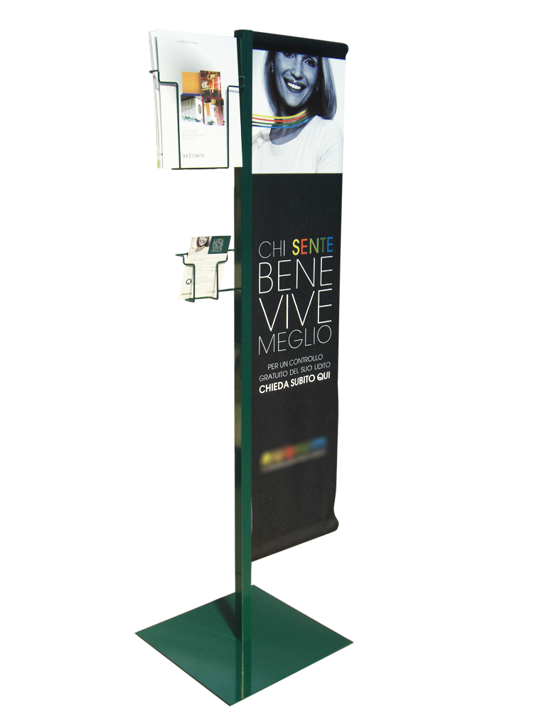 Struttura smontabile in tubolare con base in lamiera, telo stampato sui due lati, portadepliant in tondino d'acciaio